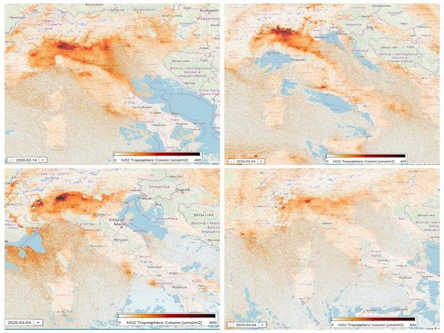 Un recente numero del mensile La nuova ecologia attesta che le immagini dal satellite diffuse dall’Esa rendono visibile l’effetto sull’inquinamento delle misure per fermare l’epidemia. Un’animazione diffusa dall’Esa mostra le fluttuazioni delle emissioni di biossido di azoto in Europa dal primo gennaio 2020 all’11 marzo 2020. Spiega Claus Zehner, responsabile della missione Copernicus Sentinel-5P dell’Esa: