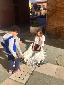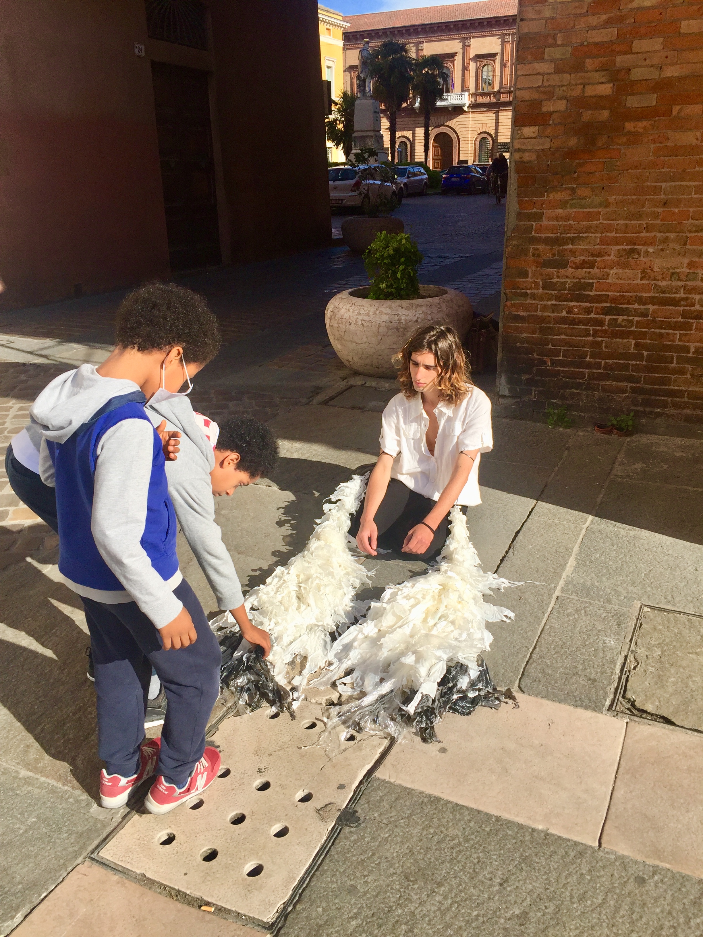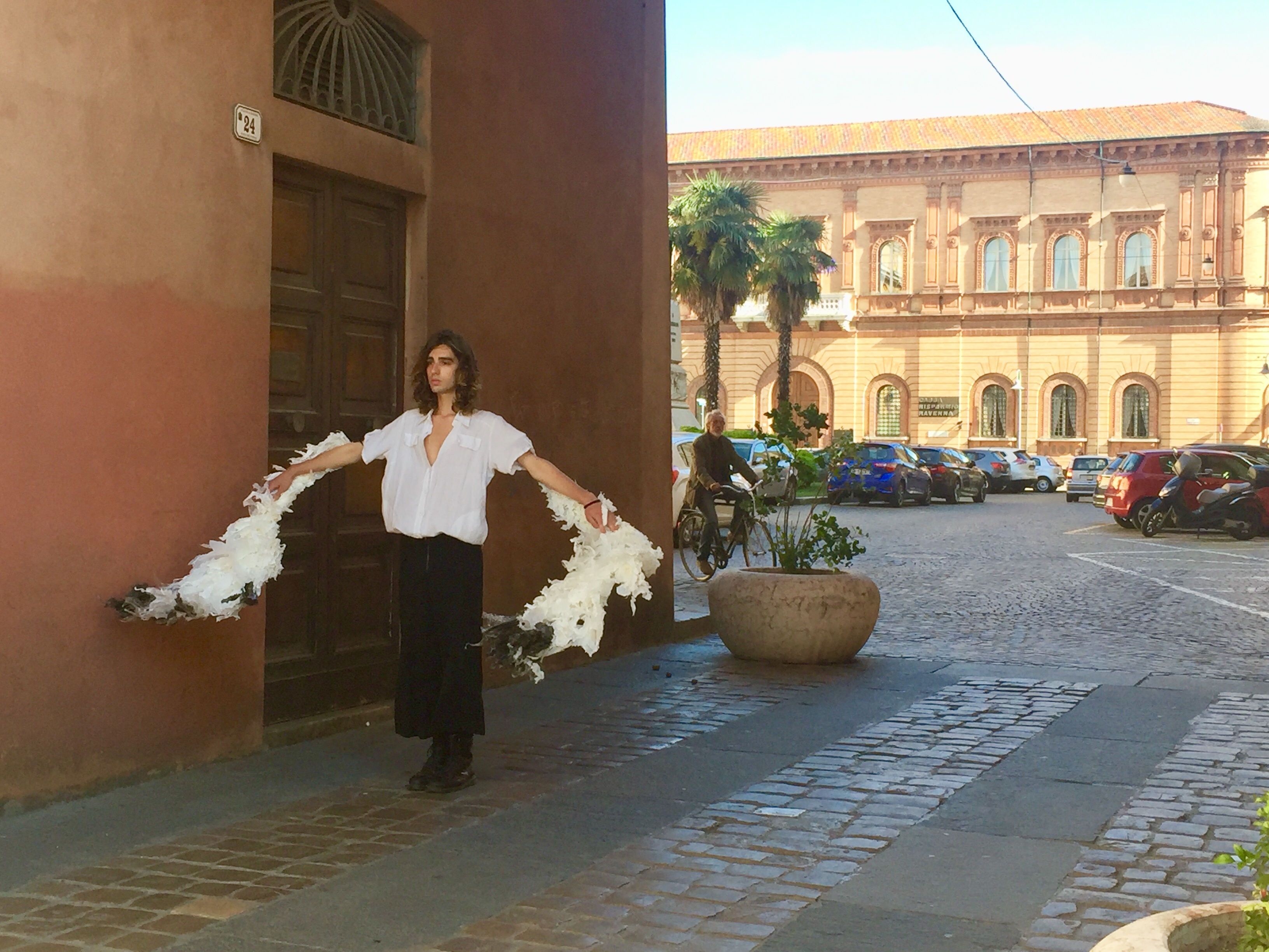 L’intervento dei passanti potrà alleggerire – togliendo pezzetti di rifiuti dalle ali del performer e gettandoli nei cestini vicini – oppure aggravare – aggiungendone invece – la libertà dell’interprete. Al pubblico è dunque lasciata totale autonomia di scelta, c’è chi probabilmente si sentirà responsabilizzato, e così facendo parteciperà ad un gesto etico collettivo, ma c’è anche chi vivrà con estraneità la schiacciante condizione di questo “Icaro contemporaneo”. È l’uomo, che con la propria sensibilità, attenzione e tutela può infatti far vivere – o purtroppo anche calpestare – l’ambiente naturale che lo circonda.